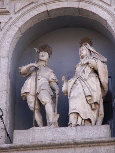 La fachada principal, que da a la calle de Toledo, destaca por su aire monumental. Realizada en piedra de granito, integra un cuerpo central de cuatro columnas corintias, presidido por un grupo escultórico con las efigies de san Isidro y su esposa, santa María de la Cabeza.